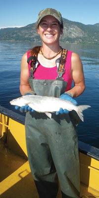 Avista fisheries technician Angie Hill, holds a lake whitefish, a bycatch on the predator netting boat. January and February are the best times for whitefishing, according to local anglers (photos courtesy Idaho Fish and Game, landscape photo by Andy Dux) |